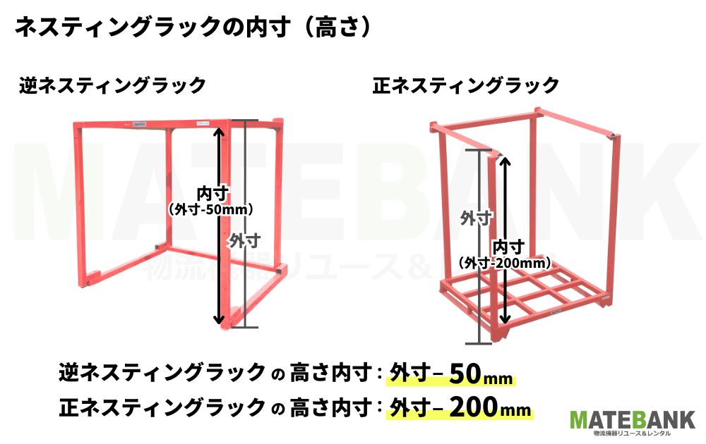 逆ネスティングラックの高さ内寸は地面からに対して柱寸の50mm分だけ小さいサイズになります。